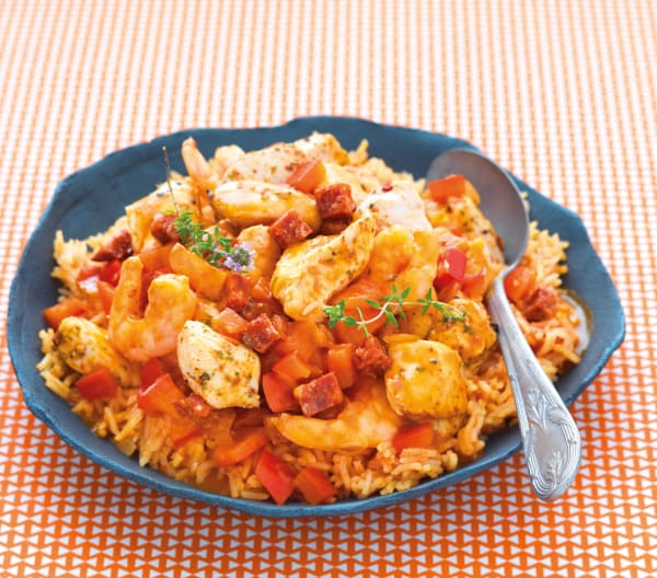 riz, poulet, crevette, poivron, chorizo, oignon, tomate